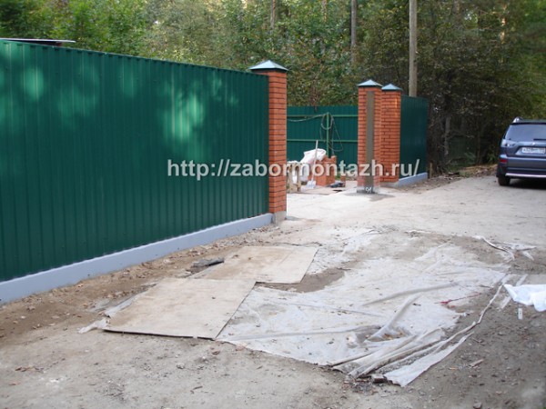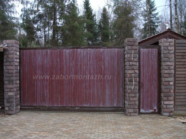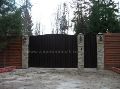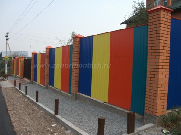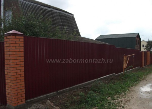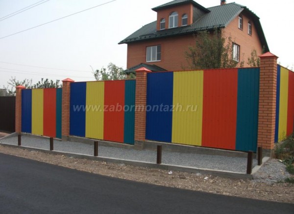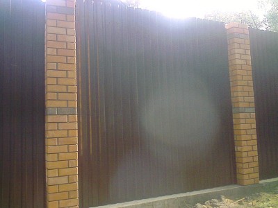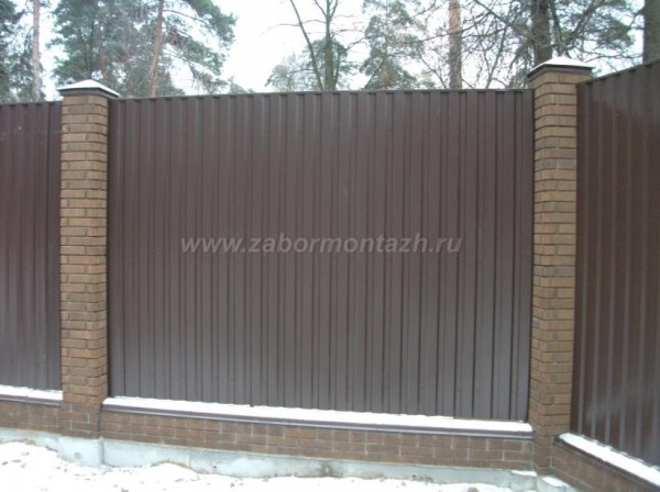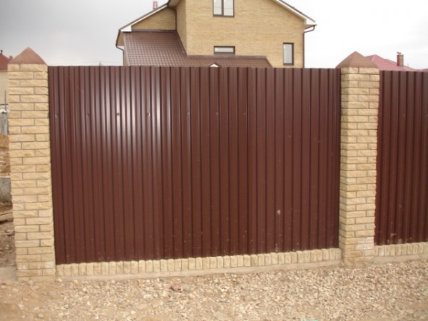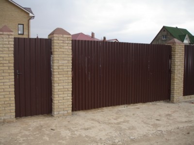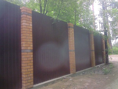 Такая комбинация превращает очень простые по сути материалы в предмет искусства. Профнастил экономичен и долговечен. Цветовую палитру можно подобрать в тон стен и крыши коттеджа. Поскольку чаще всего в таких оградах профнастил не касается земли, а имеет под собой фундамент – полотно служит гораздо дольше.