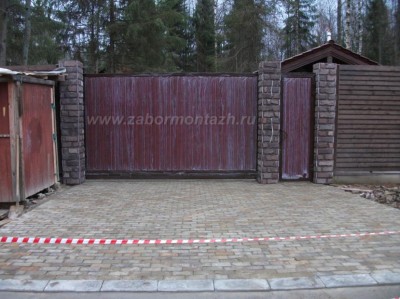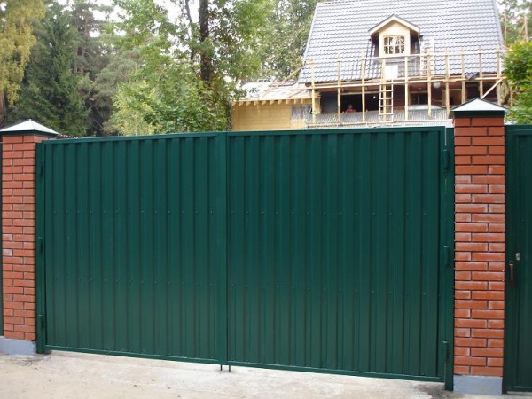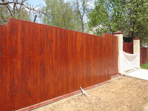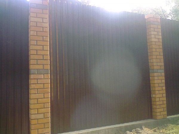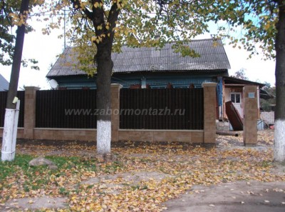 Такая комбинация превращает очень простые по сути материалы в предмет искусства. Профнастил экономичен и долговечен. Цветовую палитру можно подобрать в тон стен и крыши коттеджа. Поскольку чаще всего в таких оградах профнастил не касается земли, а имеет под собой фундамент – полотно служит гораздо дольше.