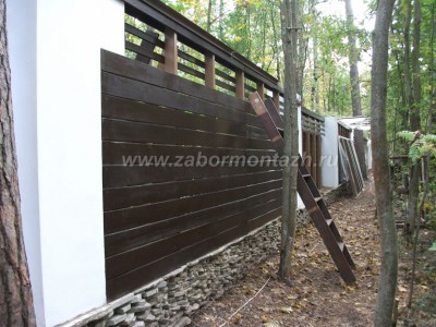 Дерево - материал довольно доступный, в то время, как кирпичные заборы обходятся дорого. Кроме того, деревянные секции прослужат дольше, находясь высоко от земли. Небольшой минус в том, что дерево все же нуждается в периодической обработке. Дизайн ограды может быть реализован по вкусу заказчика.